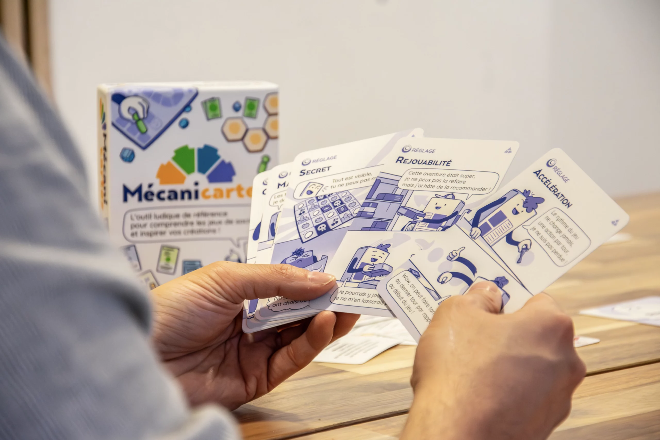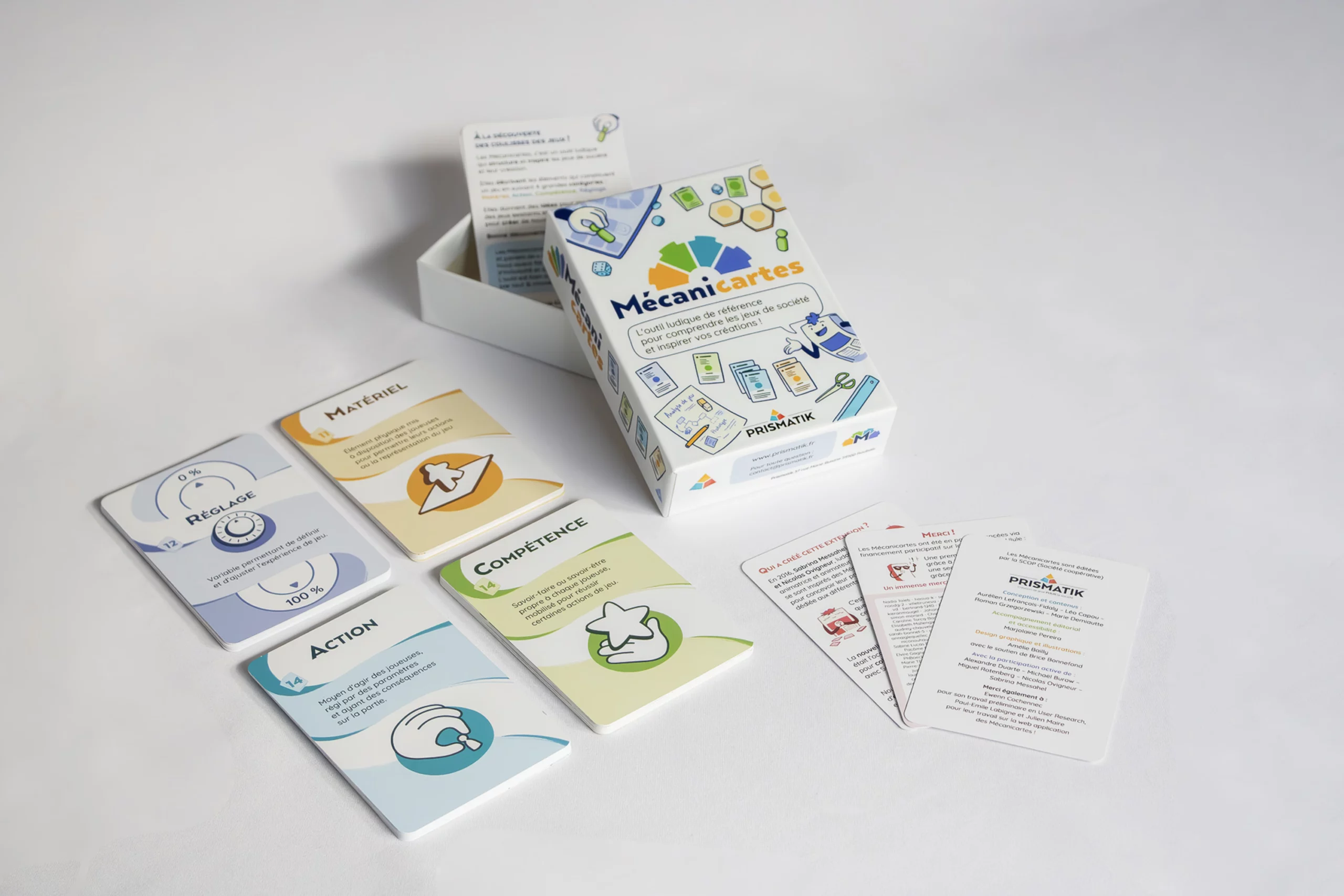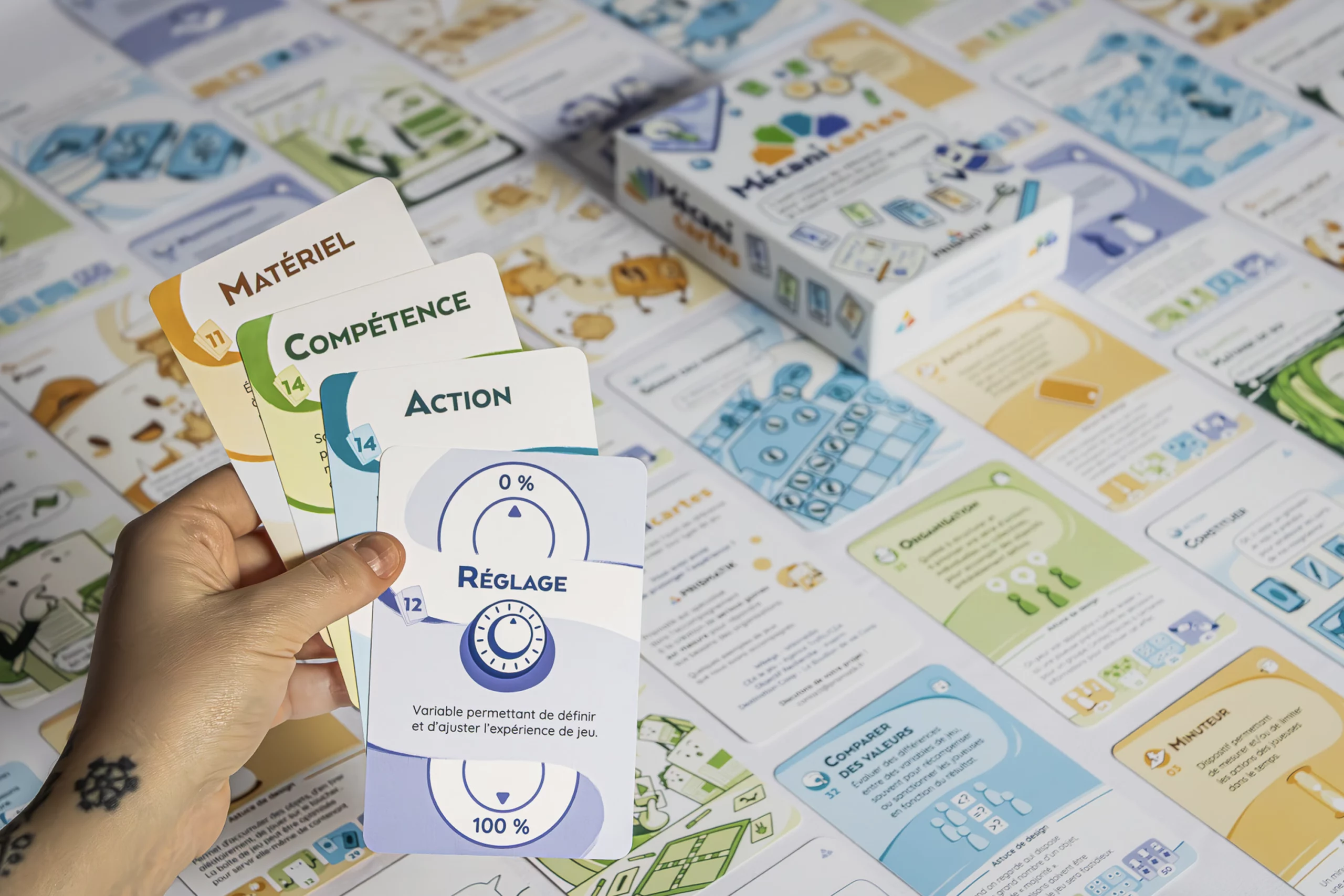 Les Mécanicartes, c’est un outil ludique qui décompose les jeux de société en actions de jeu, compétences mobilisées, matériel concret, et réglages de concepts et variables tels que le hasard ou la coopération.
