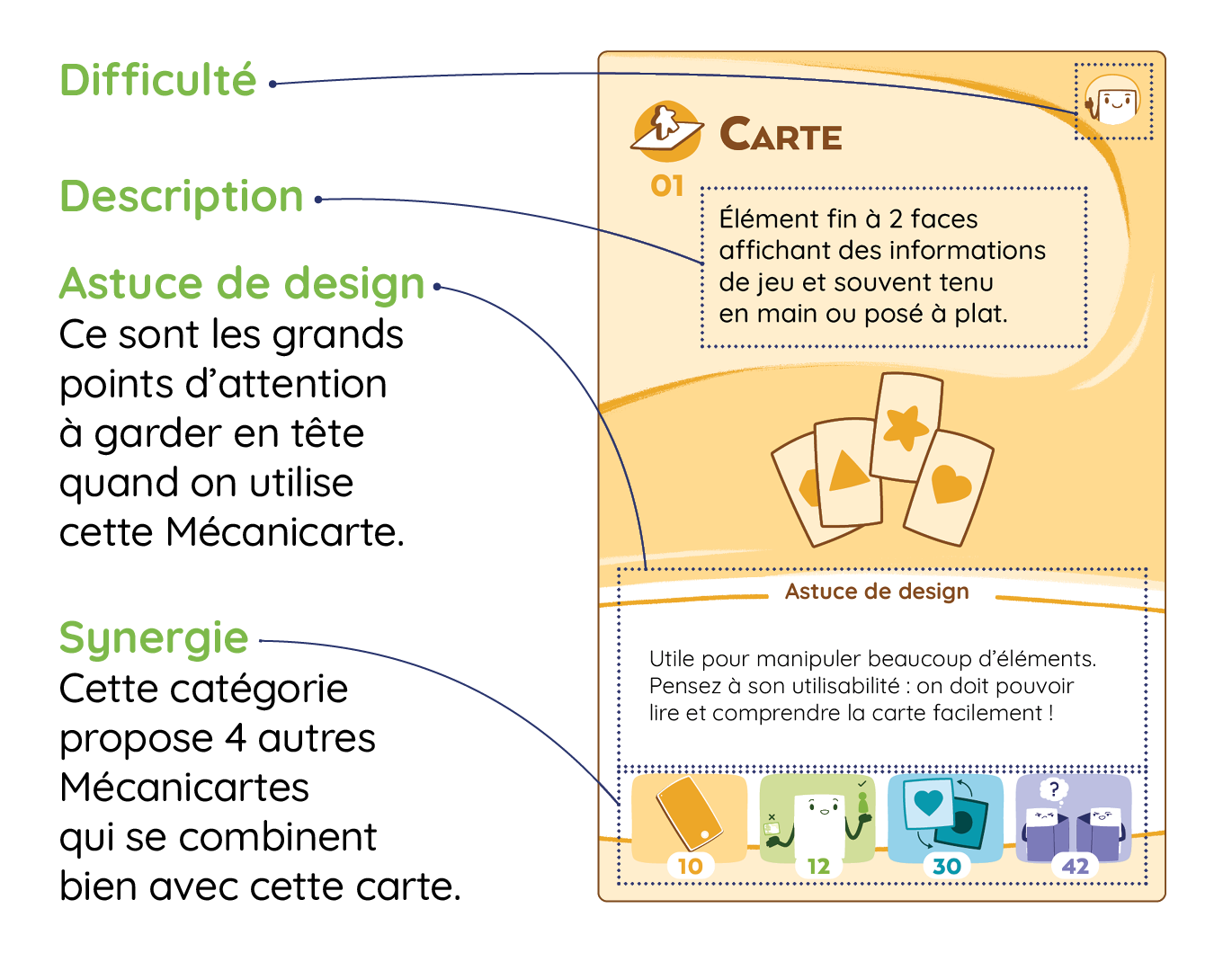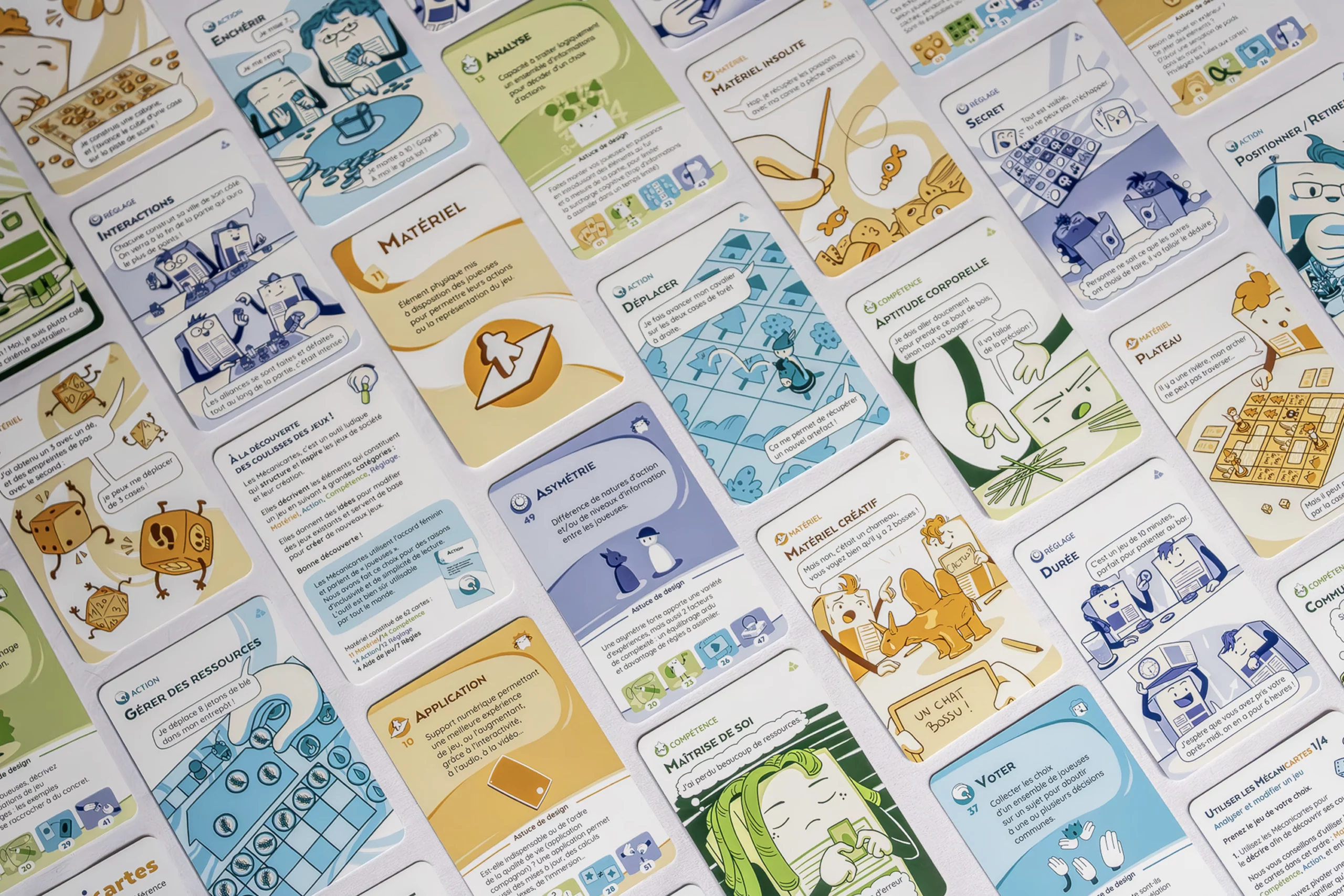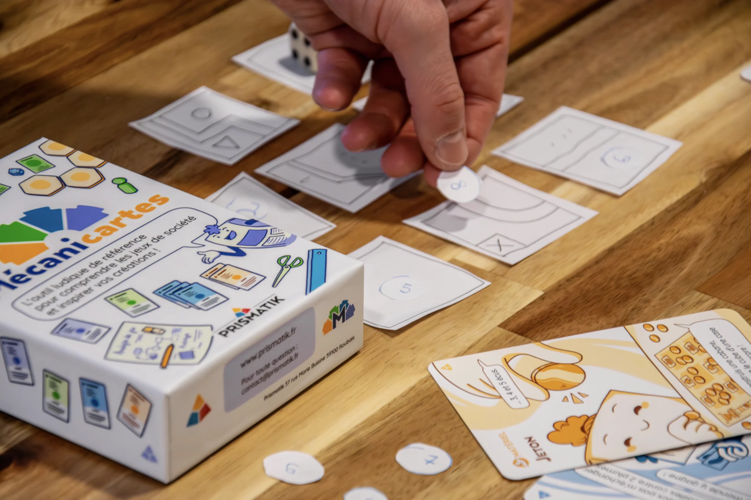 Les Mécanicartes, c’est un outil ludique qui décompose les jeux de société en actions de jeu, compétences mobilisées, matériel concret, et réglages de concepts et variables tels que le hasard ou la coopération.